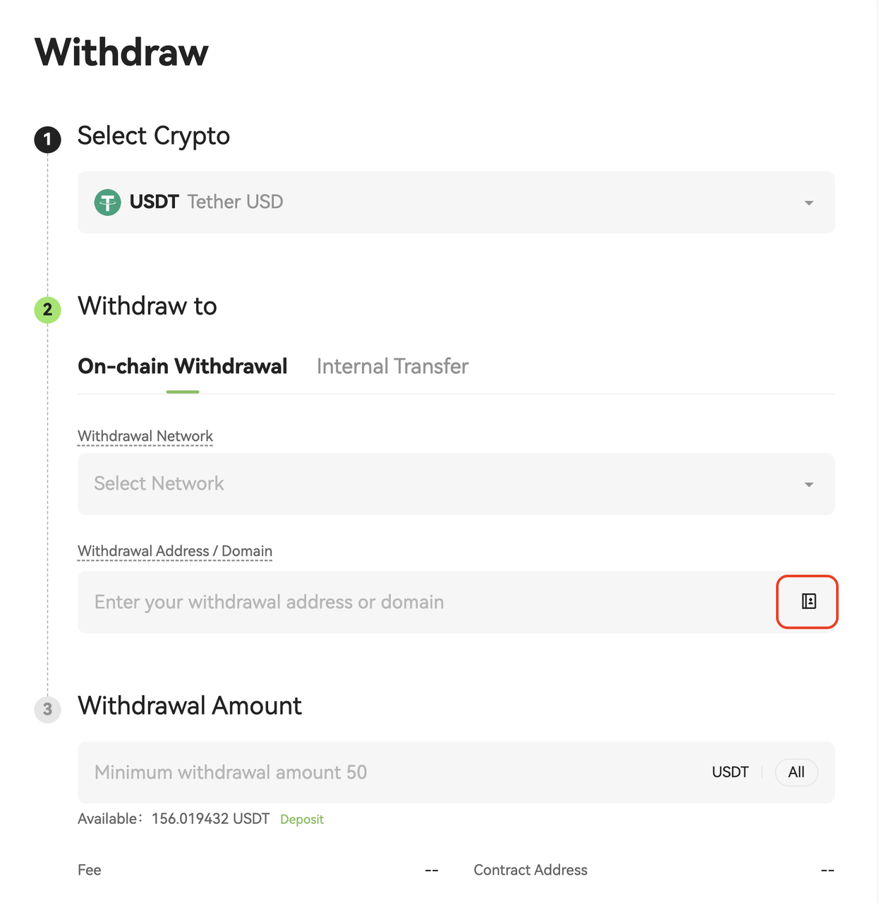 2. On the Withdraw page, click the Address Book icon to the right of the address field