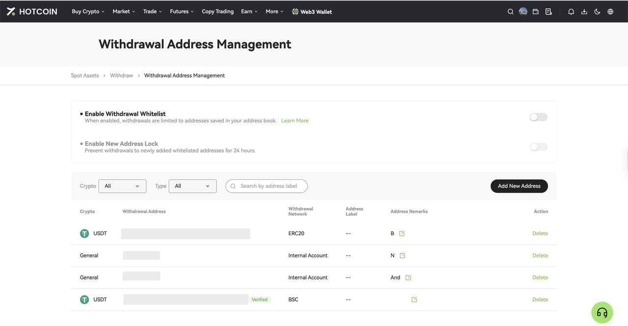 A withdrawal address is a blockchain address used to receive digital assets during a withdrawal. To enhance asset security, you can save frequently used withdrawal addresses for quick selection during future withdrawals. This article explains how to add and manage (edit or delete) withdrawal addresses on the web and introduces related security settings.