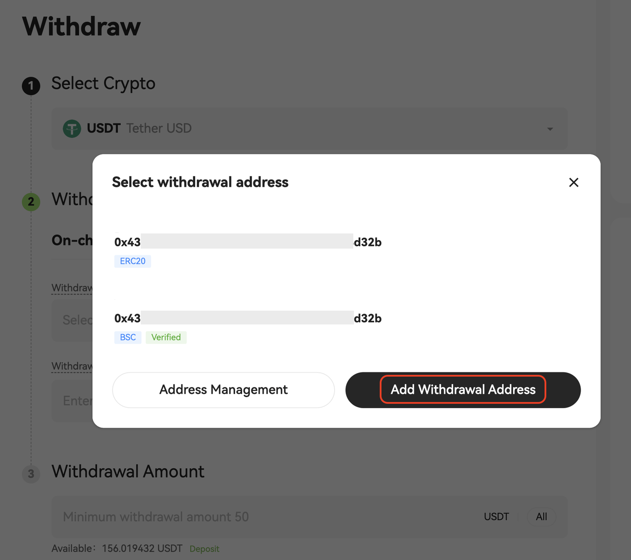 3. In the Select Withdrawal Address pop-up window, click Add Withdrawal Address